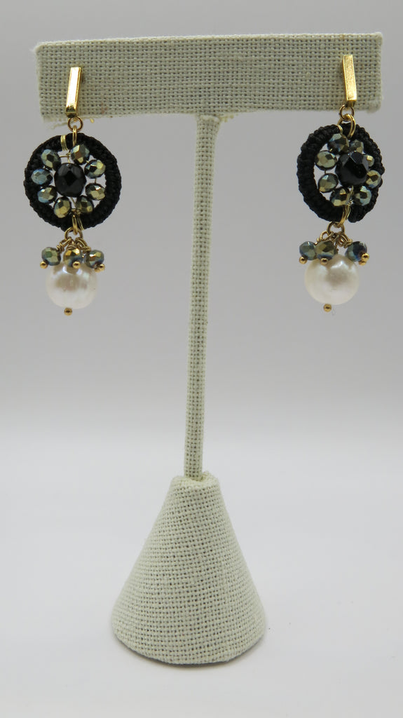 Aretes colgantes de chapa de oro, con perla y piedras negras en diferentes diseños y tamaños