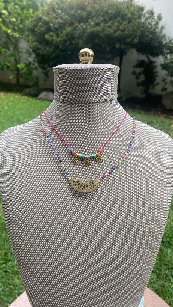 Collar chapa oro-5895-$356 Sofia Blum $ 356.00 Default Title - $ 356.00 Cantidad Este producto está agotado. Collar chapa de oro, doble con piedras de colores y dijes de flores doradas