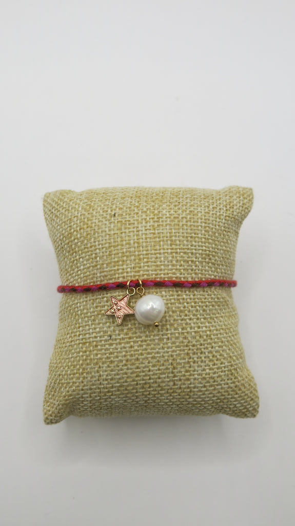 Pulsera chapa de oro, con hilo rojo, negro, lila y dijes de estrella y perla