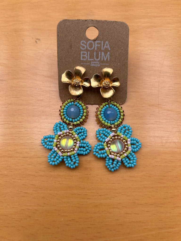 Aretes chapa de oro-8115g-$396 Sofia Blum $ 396.00 Default Title - $ 396.00 Cantidad Este producto está agotado. Aretes colgantes de chapa de oro, con diseño de flores, chaquiras azules y piedras.